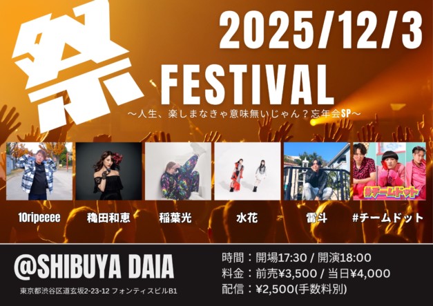 📅2025/12/3(水) 開場17:30 / 開演18:00🏢SHIBUYA DAIA👪10ripeeee / 稲葉光 / 雷斗 / #チームドット / 穐田和恵 / 水花🎫前売¥3,500 / 当日¥4,000 / …