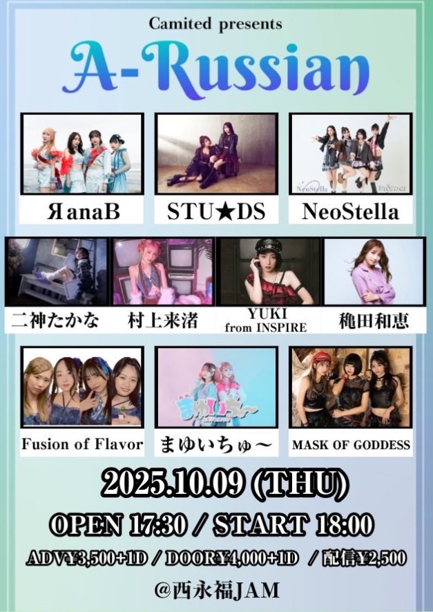 日時:2025年10月9日(木) OPEN 17:30 / START 18:00 出演 19:45~20:05会場:西永福JAM出演:ЯanaB / STU★DS / NeoStella / MASK OF GODDE…
