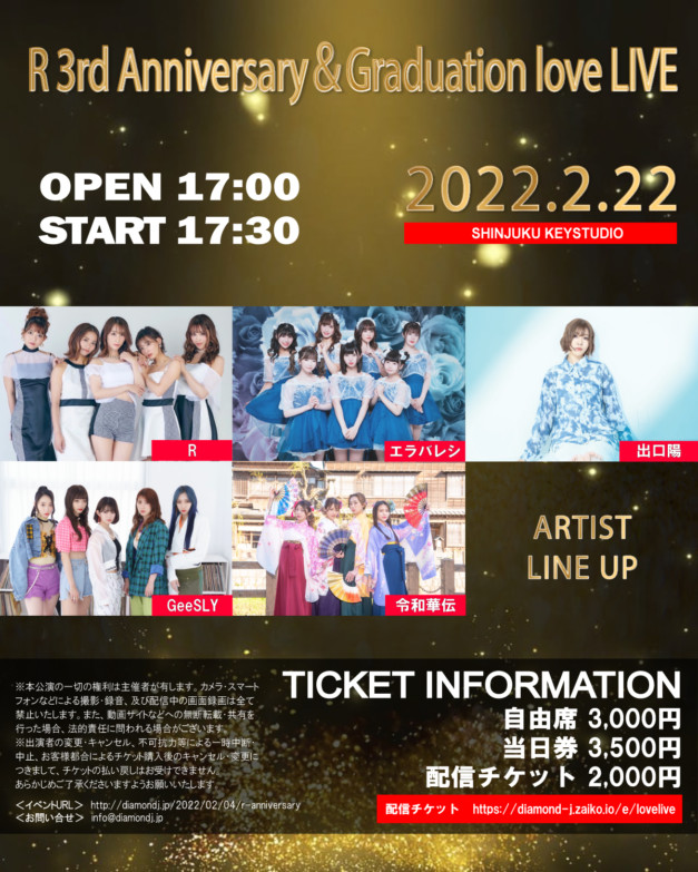 公演名:𝓡 3rd Anniversary&Graduation love LIVE日時:2022/2/22(火)開場17:00 開演17:30出演: 𝓡、 エラバレシ、 HIGH SPIRITS(休演)、出口陽、Gee…