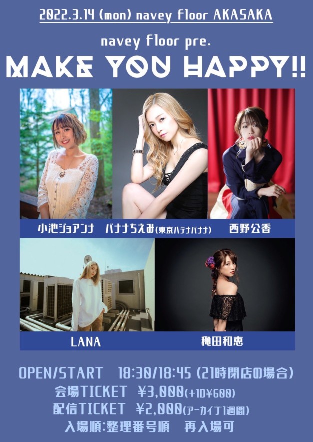 3/14(月)に穐田和恵さんが『MAKE YOU HAPPY!!』に出演します。 日時:3/14(月) OPEN/START 18:30/18:45会場:navey floor AKASAKA名称:navey floor…