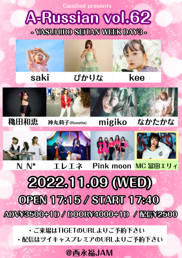 日時 2022/11/9(水) OPEN 17:15 / START 17:40会場 西永福JAM 出演 saki / ぴかりな / kee / 穐田和恵 / 神丸莉子(Runette)/ migiko/ たかたかな /…