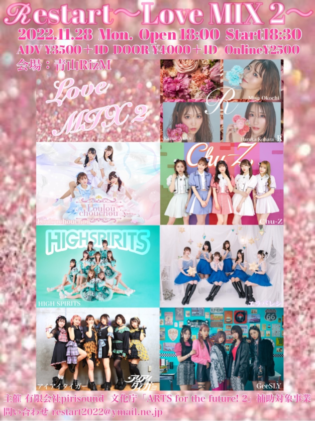 日時 2022年11月28日(月) 開場18:00 開演18:30会場 青山RizM出演 R、 Chu-Z、 HIGH SPIRITS、 エラバレシ、 Loulouchouchou、 GeeSLY、 アイアイタイガー 予…