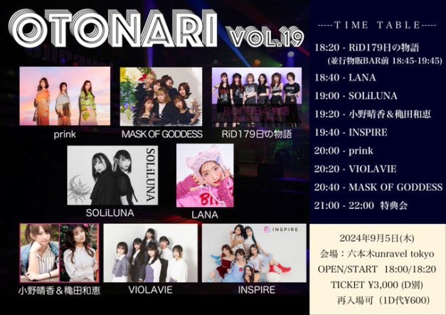 日時 2024年9月5日(木) OPEN/START 18:00/18:20会場 六本木unravel tokyo出演 prink / MASK OF GODDESS / RiD179日の物語 / SOLiLUNA / …