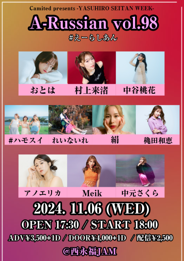 日時:2024年11月6日(水) OPEN 17:30 / START 18:00会場:西永福JAM料金:前売り¥3,500 当日¥4,000 共に+1D 配信¥2,500出演:Meik / アノエリカ / れいないれ …
