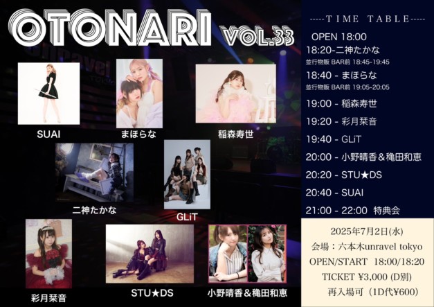 日時:2025年7月2日 OPEN/START 18:00 / 18:20場所:六本木unravel tokyo出演:SUAI / まほらな / 稲森寿世 / 二神たかな / GLiT / 彩月栞音 / STU★DS /…
