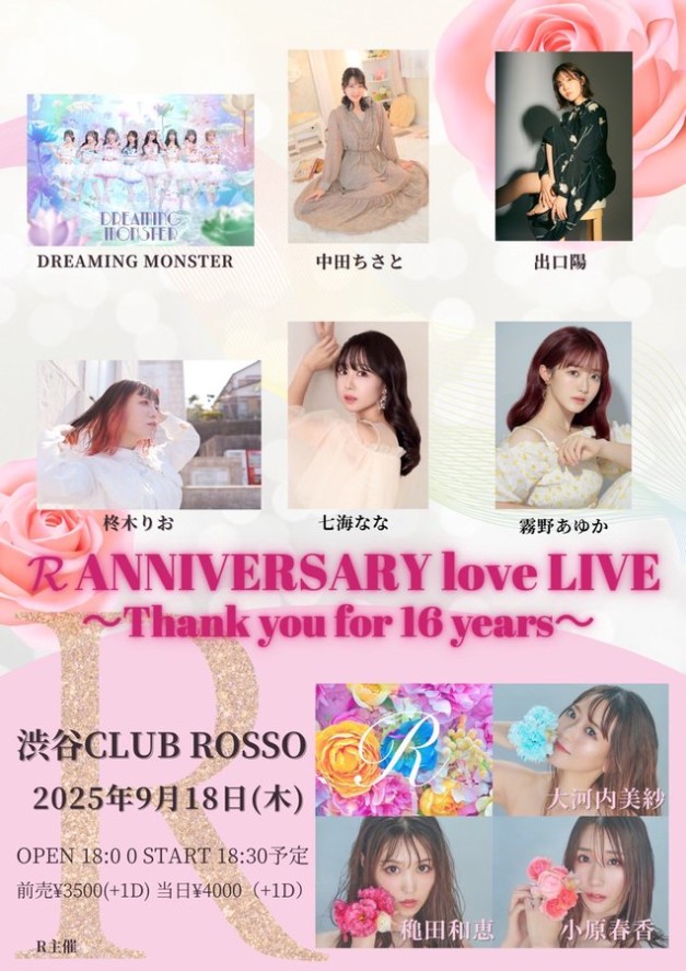 日時:2025年9月18日(木) OPEN 18:00 START 18:30会場:渋谷CLUB ROSSO出演:R、DREAMING MONSTER、柊木りお、中田ちさと、出口陽、七海なな、霧野あゆか チケット: 𝓡 …